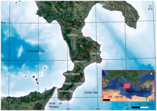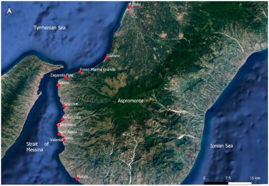 The study area is in Calabria, a region of southern Italy that is in the center of the Mediterranean Sea (Figure 1). From an administrative point of view, the Calabria region is divided into four provinces, Cosenza, Catanzaro, Crotone and Vibo Valentia, and the Metropolitan City, Reggio Calabria. The Metropolitan City is in the southern part of Calabria, has an area of over 3000 km2 and is almost totally bounded by the sea, with a strip of land about 60 km long which borders the provinces of Catanzaro and Vibo Valentia to the north. Specifically, the total length of the Metropolitan City of Reggio Calabria’s coast is more than 200 km, and it is bathed by the Ionian Sea to the south and the east, the Tyrrhenian Sea to the west, and the Strait of Messina between them, where the city of Reggio Calabria is located.