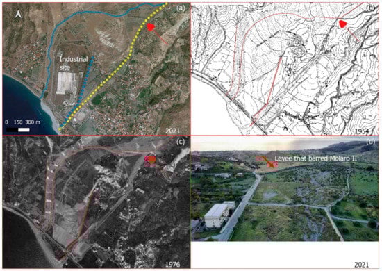 The Molaro River. (a) An image from Google Earth from September 2021. (b) The CASMEZ cartography of 1954. (c) The aerial photogrammetry of 1976. (d) The view from a drone of the levee that barred Molaro II (view from the mountain to the valley). The yellow lines are the 1954 riverbanks, the red lines are the 2021 riverbanks, the blue line is the 2021 Molaro I River, the dashed blue line is the 2021 Molaro II River and the dashed yellow line is the 1954 Molaro I River. The arrows identify the point where the levee that barred the Molaro II River was built.