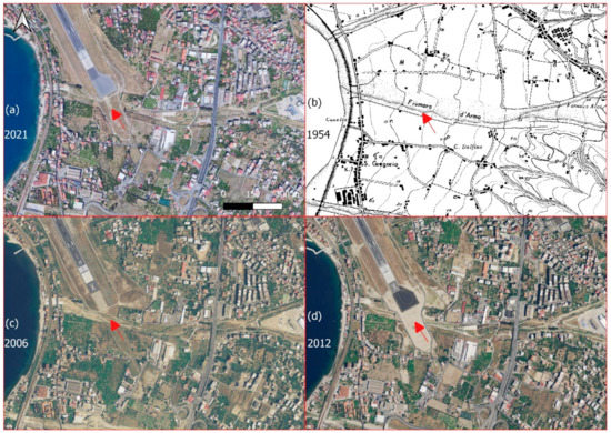 The Sant’Agata River. (a) An image from Google Earth from September 2021. (b) The CASMEZ cartography from 1954. (c) The orthophoto from 2006. (d) The view towards the mouth of the culvert below the airport runway. The arrows identify the point where the northern end of the airport runway has been extended.