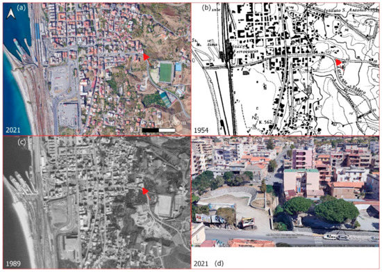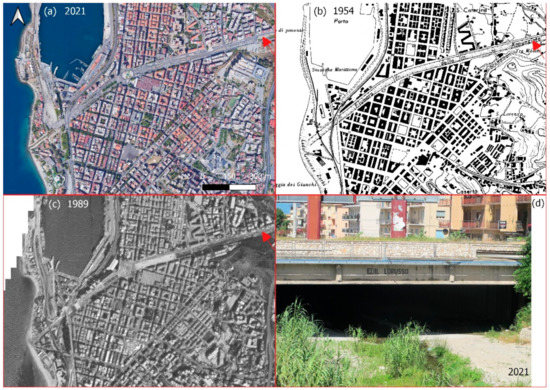 The Annunziata River. (a) An image from Google Earth from September 2021. (b) The CASMEZ cartography from 1954. (c) The orthophoto from 1989. (d) The detail of the culvert (view from the mountain to the valley). The arrows identify the upstream section of the culvert.