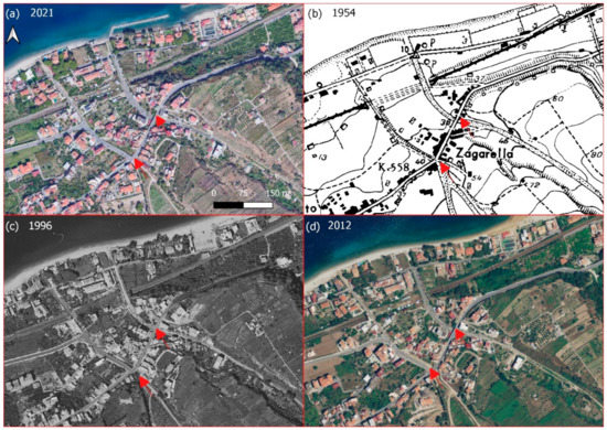 The Zagarella and Piria rivers. (a) An image from Google Earth from September 2021. (b) The CASMEZ cartography from 1954. (c) The orthophoto from 1996. (d) The orthophoto from 2012. The arrows identify the section where the riverbed was transformed into a street.