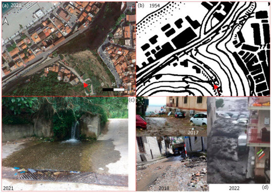The Fosso Marina Grande River. (a) An image from Google Earth from September 2021. (b) The CASMEZ cartography from 1954. (c) The point where the natural river becomes artificial. (d) The effect of the rainfall events of 2017, 2018 and 2022. The arrows identify the upstream section of the culvert.