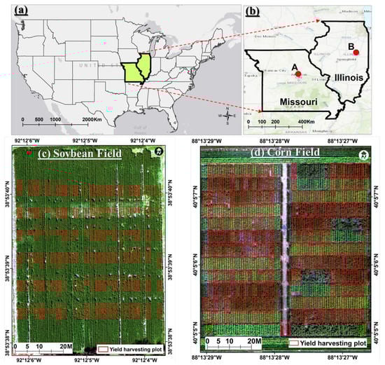 Study site location map and field layout. (a) Location of MO and IL, (b) experimental soybean field (the red dot A) in Missouri state and experimental corn filed (the red dot B) in Illinois state. (c) is UAV RGB orthomosaic of the experimental soybean field. (d) UAV RGB orthomosaic of the experimental corn field, (the red polygons are the yield harvesting spots).