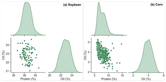 A summary of the statistics on lab-based seed protein and oil compositions from soybean and corn is displayed in Table 1. Additionally, the scatter plot of protein against oil and the distribution of protein and oil composition data are shown in Figure 2.