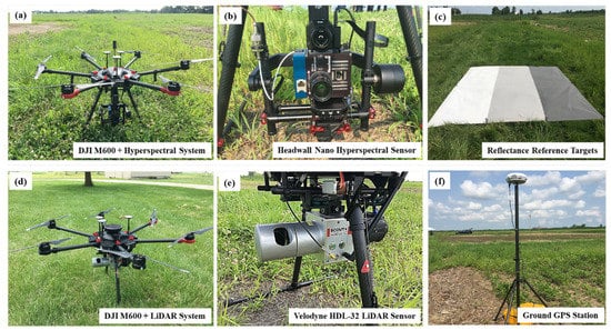 UAV systems and sensors used for data collection. (a) DJI M600 UAV platform with Hyperspectral Sensor. (b) Headwall Nano Hyperspectral Sensor. (c) Reflectance Reference Targets. (d) DJI M600 UAV platform with LiDAR sensor. (e) Velodyne HDL-32 LiDAR Sensor. (f) Ground RTK GPS Station.The figure was modified after [43].