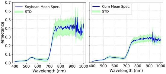 Orthorectification and geometric correction were conducted by incorporating the 3D sensor positional information recorded by onboard IMU and high resolution (10 m) digital elevation model (DEM) through relevant functions of the SpectralView tool. Finally, the geometrically corrected and orthorectified reflectance image cubes were stitched as a single image cube covering the whole field [58]. Due to low flight height, the effect of the atmosphere was not considered in this work [59], and the atmospheric correction was not conducted. The mean and standard deviation (STD) of reflectance values of each band derived from sampling plots in soybean (Figure 4) and corn (Figure 4) fields are displayed below.