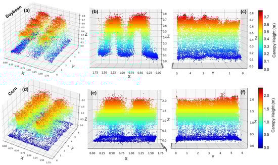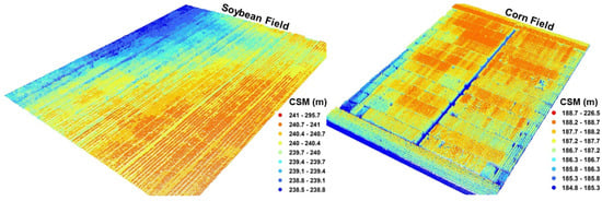 Finally, the pipeline provides classified (ground/non-ground) point clouds with ±2 cm position accuracy according to the LiDAR sensor manufacturer’s report. The preprocessed LiDAR point clouds of soybean and corn fields are displayed in Figure 5; note that the height dimension values of the point clouds are the elevation values, not the canopy height values. The red color points are mostly the higher canopy areas, and the blue color points represent the ground points primarily.