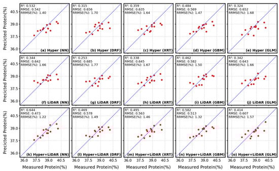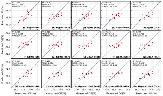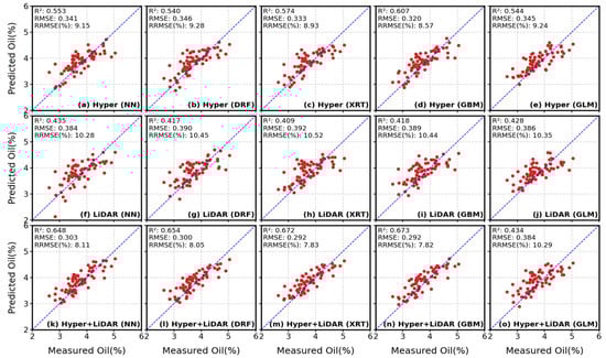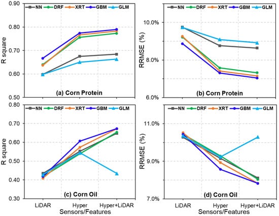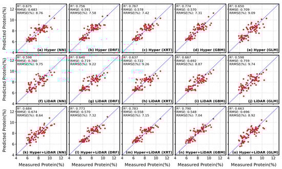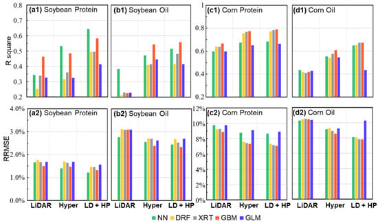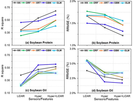 Machine-learning methods NN, DRF, XRT, GBM and GLM under the H2O-AutoML framework were used to predict the protein and oil concentrations of soybean seed using hyperspectral and LiDAR data alone, as well as their combination (denoted as Hyper + LiDAR) (Table 6 and Table 7). The model validation statistics for soybean protein concentration estimation are presented in Table 6. Canopy spectral and texture features derived from hyperspectral imagery yielded prediction accuracies (R2) for protein ranging from 0.315 to 0.532 and RRMSE from 1.70% to 1.40% (Table 6).