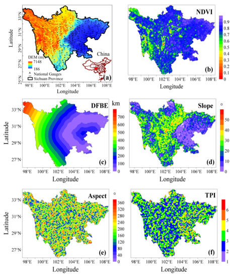 (a) Geographical location and digital elevation model (DEM) of the study area, and the spatial distributions of national gauges stations (black pentagrams); (b–f) represent the distributions of NDVI, DFBE, slope, aspect, and TPI over Sichuan Province, respectively.