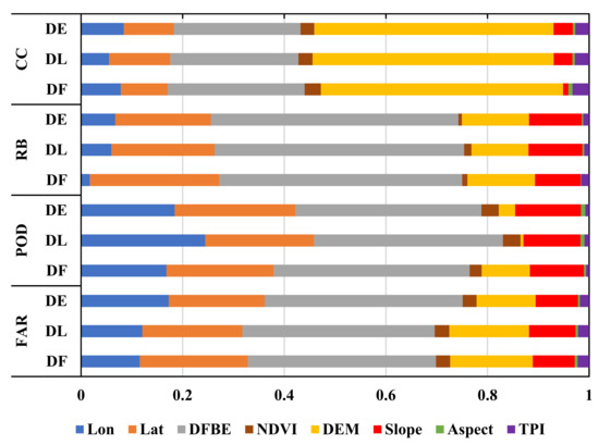For all the IMERG estimates, DEM is the most sensitive feature for the CC (weighs around 0.47), followed by DFBE and Lat (weighs about 0.26 and 0.10, respectively). Meanwhile, these three geographical features, which have similar weight distributions, are also the most important sensitive sources of the RB and the FAR, among which DFBE becomes the most important contributor (weights > 0.38), followed by Lat and DEM (weights are about 0.2 and 0.14, respectively). The POD is mainly determined by DFBE, Lat, and Lon, with weights of 0.38, 0.22, and 0.17, respectively. The significant differences in the DEM weights in the POD between NRT IMERG daily estimates and IMERG-DF are that the weight of the former is only around 0.01, while the weight of the latter is as high as 0.11. In addition, we also notice that the influence of slope on the RB, POD, and FAR is much larger than that on the CC, while DEM shows a much greater impact on the CC than the impact shown by other metrics.