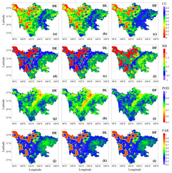 Spatial distributions of the statistical metrics for the IMERG-DE (left column), DL (middle column), and DF (right column): (a–c) CC, (d–f) RB, (g–i) POD, (j–l) FAR.