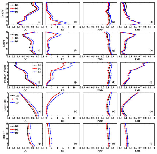 The longitude, latitude, DFBE, DEM, and slope ranges are divided into many statistical intervals with steps of 0.5°, 0.5°, 50 m, 500 m, and 10°, respectively. Then, their average values are calculated in each statistical interval, and the statistical results are shown in Figure 4. Figure 4 shows that the curves for the IMERG-DE with any geographical feature are found to coincide with those of the IMERG-DL, and are very similar to the curves of IMERG-DF in terms of CC, POD, and FAR. For RB, curves of NRT IMERG daily estimates and IMERG-DF reveal a noticeable gap among the low longitude and high-latitude areas, DFBE, and DEM. The variation trend of geographical features makes the curve of POD little change, but the curves of other statistical metrics show large fluctuations.