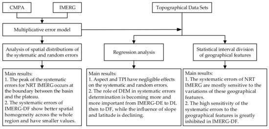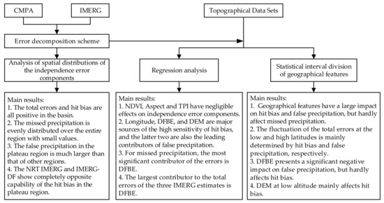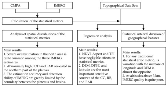 Furthermore, it is also found that, with the increase in slope, the fluctuations of all statistical metrics are smaller than that with other geographical features. The trend of statistical metrics reveals that the increase in slope slightly reduces the overestimation error of IMERG estimates and weakens the positive correlation with the precipitation observations but does not affect the precipitation detection capability. Finally, an obvious conclusion is that slope has a significantly weaker impact on IMERG data quality than other geographical features. Finally, to clearly show the inputs, statistical techniques, and results of each step in the analysis, the flowchart is shown in Figure 5.