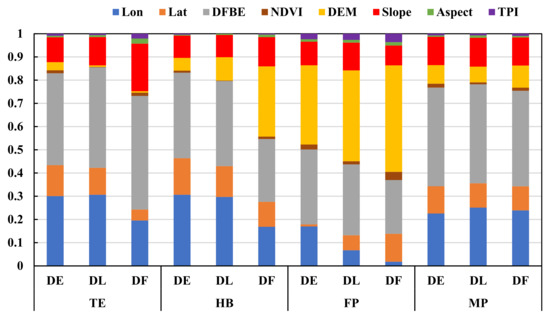For all traditional statistical error metrics, the values of the regression model are between 0.55 and 0.73. Note that the CC has the highest values, exceeding 0.65. These results indicate that the traditional statistical error metrics and geographical features have obvious, even significant, linear relationships. Subsequently, the regression analysis is used to calculate the correlation between statistical error metrics and geographical features, and the results are shown in Figure 2. Figure 2 shows that for any statistical metrics, longitude, latitude, DFBE, DEM, and slope are the main contributors to the errors because the sum of their weights exceeds 94%, which means that NDVI, aspect, and TPI have a nonlinear relationship with the geographical features.