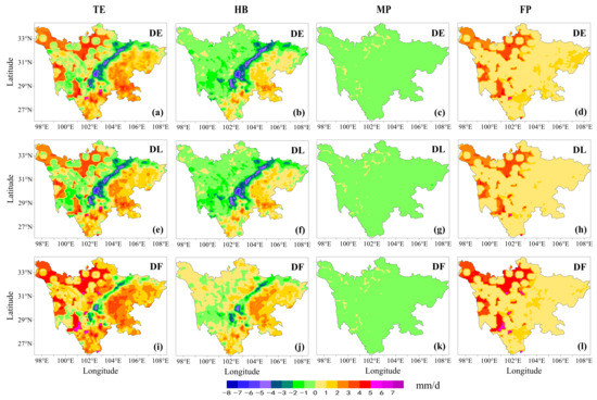 Spatial distributions of mean errors components for the three IMERG estimates: columns from left to right are (a,e,i) total errors (TE), (b,f,j) hit bias (HB), (c,g,k) missed precipitation (MP), and (d,h,l) false precipitation (FP), respectively; rows from top down are IMERG-DE, IMERG-DL, and IMERG-DF, respectively. The error components are related by TE = HB + MP + FP, all in mm/d.