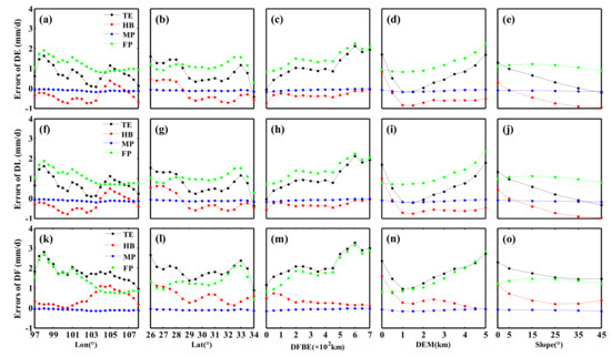 The distribution of total errors and three independent components with five geographical features for the IMERG-DE, DL, and DF estimates. From left to right, five columns represent longitude (a,f,k), latitude (b,g,l), DFBE (c,h,m), DEM (d,i,n), and slope (e,j,o), respectively. From top to bottom, three rows represent errors of IMERG-DE (a–e), DL (f–j), and DF (k–o), respectively.