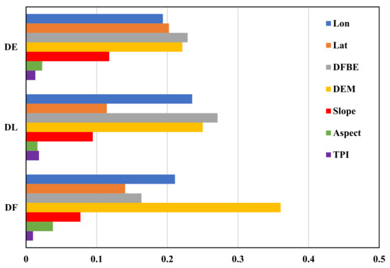 The results clearly show that longitude, latitude, DFBE, DEM, and slope have significant effects on the systematic and random errors of all IMERG estimates, and the weight values of aspect and TPI are almost negligible. For IMERG-DE, the first four geographical features have similar weight values, which are almost twice the weight values of the slope. Compared with IMERG-DE, the weight value of latitude in IMERG-DL decreases significantly (from 0.2 to 0.1). For IMERG-DF, DEM is the most critical error determinant, and its weight value is far ahead of that of other geographical features. At the same time, we also found that with the increasing complexity of error correction schemes from IMERG-DE to DL and then to DF, the role of DEM in error determination is becoming more and more important, while the influence of slope and latitude is declining.