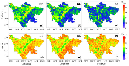 Spatial distributions of systematic errors (the first row, a–c) and random errors (the second row, d–f) in percentage form for the three IMERG estimates. From left to right, three columns represent IMERG-DE (a,d), DL (b,e), and DF (c,f), respectively.