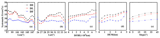 Relationships between systematic errors and five geographical features for three IMERG estimates. (a–e) represent longitude, latitude, DFBE, DEM, and Slope, respectively.