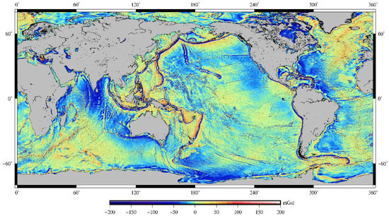 - Sandwell, D.T.; Müller, R.D.; Smith, W.H.F.; Garcia, E.; Francis, R. New global marine gravity model from CryoSat-2 and Jason-1 reveals buried tectonic structure. Science 2014, 346, 65–67. [Google Scholar] [CrossRef] [PubMed]