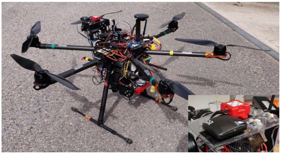 A custom-built hexacopter was developed for the research. The UAV is presented in Figure 1. The drone frame is a Tarot T960 that has a diameter of approximately one meter. The drone has six brushless motors (T-Motor U7 2.0 420 KV) with 18-inch (45.7 cm) propellers (Tarot 1855). Each motor has its own electronic speed controller (ESC) (T-motor T80A). The flight controller is a Pixhawk 2 cube. The whole drone was powered by one 14,000 mAh LiPo battery with six cells in series, resulting in nominal voltage of 22.2 V. The drone weight is 10 ± 0.5 kg (including battery weight, cameras, and their gimbals); the estimated flight time was 7 min, which left approximately a 30% charge in the battery after a flight mission. This was done to ensure a longer lifespan of the batteries and to prevent voltage drops during the flights.