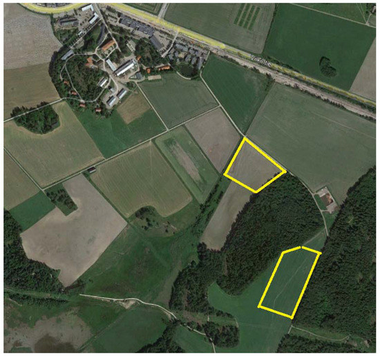 Research fields are marked with yellow stripes on the picture. The upper field is named Mölylä and the other field is Koirasuo. The picture is from Google Earth, June 2020.