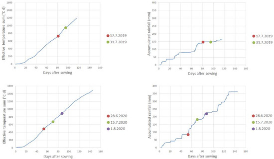 Accumulated rainfall (mm) and effective temperature sum (°C d) for both measurement years. The effective temperature sum was calculated by measuring the average temperature of each day, subtracting 5 °C from it, and summing the positive differences with each other. The flight days are marked as dots.