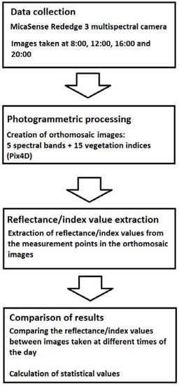 Multispectral image and weather data were collected during two growing seasons. From the multispectral images, 15 vegetation indices were calculated for a more detailed inspection. This study examined how the vegetation indices and values of spectral bands changed on the field at different times of the day. Among the vegetation indices, NDVI was minorly affected by the field conditions, and the mean and standard deviation values for NDVI were similar between different measurements. NDVI and TVI performed the best out of the vegetation indices, with coefficients of variation value under 5%.