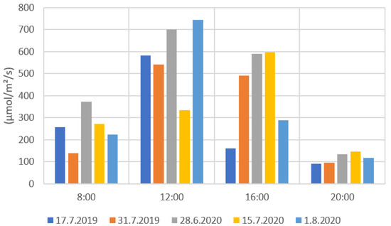Figure 9 and Figure 10 present the results from the ground level solar radiation measurements during the drone flights. Both radiation values were notably higher during the measurements at 12:00 and 16:00 than at 8:00 and 20:00. The much lower radiation values in some measurements (e.g., 31 July 2019 at 12:00) were caused by the clouds preventing radiation to reach the ground. When comparing Figure 9 and Figure 10, the PYR and PAR results are very similarly distributed. This is due to that the measuring range of the PAR sensor being part of the measuring range of the PYR sensor. The PYR sensor measures radiation coming from a wider spectrum. The solar elevation has a clear effect on the solar radiation values. The 8:00 and 20:00 radiation values were clearly lower when the sun’s elevation values were also low (Appendix B, Table A2).