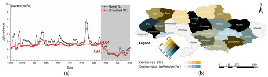 (a) Daily mean light radiation curve of Ukraine on the national scale (gray background represents the period of conflict); (b) The rate and magnitude of light decay at the oblast scale.
