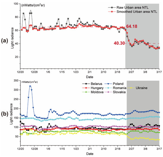 (a) Daily mean light radiation curve of the urban area of Ukraine and (b) Surrounding countries (gray background represents the period of conflict).