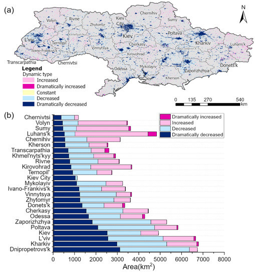 Pixel-scale Theil–Sen median trend and Mann–Kendall testing analysis of lighting dynamics can reveal a more fine-grained impact of war on the power supply. To exclude the possible increase in light emission due to the Christmas and New Year holidays, we have slightly shortened the observation period. Based on Figure 3, the observation period was defined as 15 February 2022 to 15 March 2022. Here, based on the multidimensional trend analysis tool of the ArcGIS Pro platform, the dynamic types of light radiation in Ukraine were exported, as shown in Figure 5a. It can be observed that the dramatically decreased pixels were concentrated in the urban areas of Ukraine, such as Kiev city, Kharkiv city, etc. The total area suffering from power shortages has exceeded 32,000 km2. In addition, we still detected a few pixels with elevated light radiation in Ukraine. These strongly elevated pixels were very scattered and mainly distributed in rural and suburban areas, with a total area of less than 1500 km2, which was only 4% of the power shortage area. Figure 5b counts the changed pixel’s area for each region. Among them, Dnipropetrovs’k possessed the most dramatically decreased pixels, covering an area of about 3100 km2, while Kharkiv covered a similar area of about 3000 km2, and L’viv and Kiev were closer at about 2500 km2. Of particular interest was the capital, Kiev city, where the dramatically decreased pixels covered an area of about 1000 km2, accounting for 60% of the total area of the region. For the dramatically increased pixels, Luhans’k reached the largest area of 402 km2, followed by Transcarpathia and Donets’k with 190 and 110 km2 respectively.