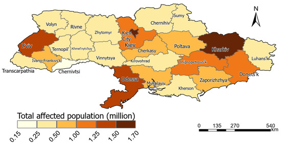 The estimated population within the Ukrainian oblasts affected by the power shortages triggered by the Ukrainian-Russian conflict. Specifically, the affected population for each oblast was estimated by summing up the LandScan HD layer pixel values for the deep blue (dramatically decreased) areas in Figure 5a.