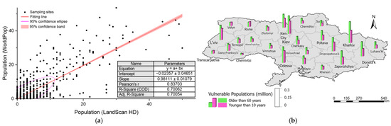 First, we evaluated the feasibility of migrating WorldPop GPPD population structure profiles into LandScan HD for Ukraine, due to their inconsistent data acquisition times. Therefore, multiple sample areas of the population clusters were selected, and a linear regression analysis was deployed to assess the correlation between the two datasets based on the correlation coefficients. Next, based on the WorldPop GPPD, the coefficients for the ratio of the population below 10 years and above 60 years were exported according to Equation (7). Finally, these coefficient layers were correlated with LandScan HD for Ukraine population layers to calculate the distribution of vulnerable populations (Equation (8)).