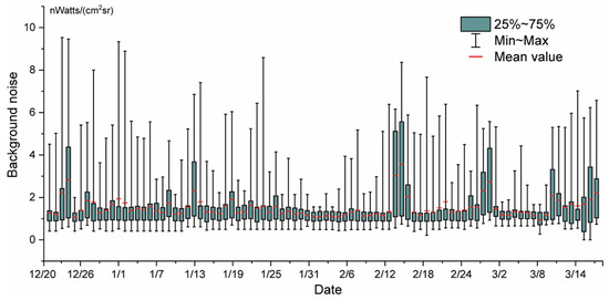 To confirm our speculation and reveal the effect of background noise on the daily mean light radiation values, a method that was previously used to remove background noise from NTL images was referenced. Specifically, based on a priori knowledge, more than 30 sample regions of theoretical “dark pixels” in the study area were selected (the extraction position of the pixels is uniform across days), which are located in mountains, forests, and large areas of water without any artificial illumination traces. Then, the mean pixel value of the “dark pixels” was calculated for each day. As shown in Figure 8, the background noise values were within 2 nWatts/cm2/sr on most of the days across the 88-day observation period, which was consistent with the findings of previous studies [47,48]. In addition, several elevated noise incidents were observed on certain dates, such as 23 December, 12 January, 14 February, 28 February, and 16 March, with an average noise of about 4 nWatts/cm2/sr. Further, for the days with a surge in light radiation values (e.g., >5 nWatts/cm2/sr) in Figure 3a, a linear correlation analysis between their light radiance and the background noise identified was performed, and the results confirmed a strong positive correlation between them with a correlation coefficient of 0.82.