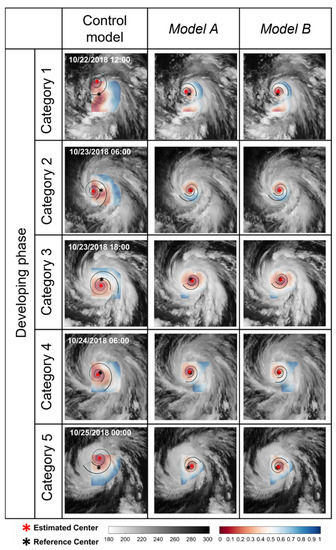 Using Typhoon YUTU in 2018, the intensity- and phase-wise TC center estimation results from the three models were validated. The ROI sizes and TC center detection errors are listed in Table 7. Models A and B calculated Fmat in the ROI extracted using an SCM, whereas the control model calculated Fmat in a 125-pixel-square ROI based on the initial guess for a TC center. For Typhoon YUTU (2018), the ROI size of models A and B decreased by 31–61%, respectively, compared to the control model; therefore, the ROIs in models A and B were narrower than those of the control model. As shown in Table 7, the detection performances of models A and B are superior to those of the control model. This suggests that SCM-based ROI extraction and improved LSB contribute to the accurate detection of TC centers. Comparing the detection performance between the two proposed models, model B demonstrated more accurate detection results in the eight cases of Typhoon YUTU (2018) than the other models. It is suggested that the revised Fmat with an SCM in model B improved TC center detection. Figure 8 depicts the TC center detection results of the three models for the TCs listed in Table 7. The weaker the TC, the more likely it was for the control model to misidentify the TC outflow as a TC center, whereas models A and B detected the TC center relatively well. This is because the ROIs of the proposed models were able to exclude regions that could be incorrectly identified, such as a region with deep convection, but not a TC center region. This is evident in the case of the TCs at 0600 UTC on 30 October 2018 (category 3 TC in the decaying phase). While the outflow region was incorrectly identified as a TC center by the control model, models A and B had already excluded this region from the ROIs. In other words, the SCM helped to reduce confusion in TC center detection.