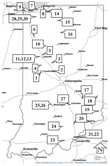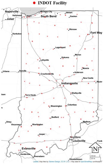 The Indiana Department of Transportation (INDOT) spends a considerable amount of their annual budget on salt for winter operations. Annually, anywhere from USD 30 million to USD 60 million of their operating budget is allocated for salt material and delivery, which is then distributed among their 140 facilities statewide. Figure 1 shows the strategic location of salt storage and maintenance facilities statewide, evenly spaced and generally located near interstate or US routes.