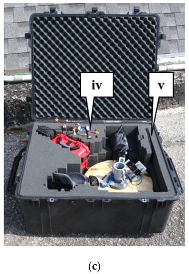 There are several key components for the SMART System to be operational and portable. The system, outfitted with all its components, can be seen in Figure 3 below. The compact design makes the system easy to transport and convenient to collect data anywhere. The primary components of the system, as observed in Figure 3a, are a GoPro Hero 9 RGB camera (callout i), and two Velodyne VLP-16 LiDAR sensors (callout ii). The two LiDAR sensors, with different coverage areas, provide a greater point density, increased redundancy, and occlusion reduction compared to a single unit. Figure 3b shows the portable tripod that is used and the quick connect PVC/Polyvinyl chloride connection for fast and easy setup (callout iii). The remaining components can be observed in Figure 3c in the traveling case, which includes the power source (callout iv), and the user interface tablet (callout v).