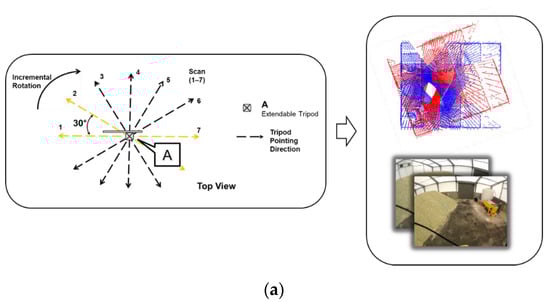The SMART system’s development, data acquisition procedure, and data processing strategy in this study are based on an early prototype system proposed by Manish et al., 2022 [26]. Figure 4 illustrates their proposed approach. When conducting an onsite data acquisition, the SMART system is placed on the tripod for scanning. Due to the limited field of view of the camera and LiDAR sensors, the system is rotated manually at a clockwise increment of 30 degrees (as illustrated in Figure 4a) to capture data points enough to cover the stockpile. The orientation of the LiDAR units and camera require the 30-degree rotation to be performed 7 times with LiDAR capturing 10-s-long scans. This results in LiDAR/RGB data collected over 180 degrees of rotation, the first scan being at 0 degree and the final scan 180 degrees from the first. With two LiDAR units, the procedure collectively obtains a complete 360-degree scan of the facility. Depending on the size of the stockpile, not all areas of the pile may be visible to the system at a given location which would motivate the use of multiple stations for data collection.