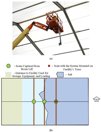 Testing locations for optimal permanent installation (a) Installation and Data Collection on Boom Lift (b) Location of Scans Relative to Salt Pile.