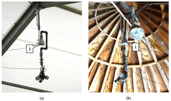 The system was mounted in the Lebanon salt barn (Figure 10a) and salt dome (Figure 10b). The functionality still worked the same as the portable unit except now there is a rotating motor, seen as callout i in Figure 10, to perform a 270-degree rotation for scanning at 30-degree increments, without overlap. This motor provided greater coverage of the storage facility, improved coarse registration quality, and reduced estimation errors, some of which were also observed in similar studies [31,32]. Mounting the system at the peak of the structure increased visibility by 10% making only 25% of the whole pile not visible to the system which provides more accurate estimates. The percent not visible to the system can be minimized by pruning the peaks of salt while piling. Nonetheless, the volume estimation procedure is not a serious concern since the interpolation is still able to calculate an accurate estimate of the stockpile. The accuracy was also verified through terrestrial laser scanning [26].