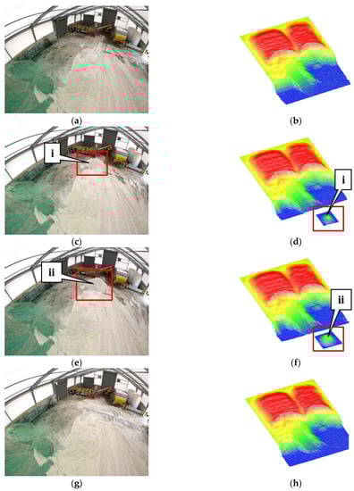 The principles of conservation of volume are used to provide a quick test of the system. To determine and validate the accuracy of the SMART salt system, a salt repositioning test was performed. This test collected data in a series of four scans with the permanent installation in the salt barn. The initial scan can be seen in a GoPro image collected directly from the system as Figure 11a and as a digital surface model from the processed point clouds in Cloud Compare as Figure 11b [30]. This serves as the baseline volume for the following three scans. The total volume is 2156 cubic yards (1648 cubic meters). A payloader moved five buckets of salt from the initial stockpile to the front of the pile/facility (in the storage/loading area) to simulate the removal of salt for use on roadways, which can be seen as callout i in Figure 11c,d below. After scanning, the initial stockpile has 2149 cubic yards (1643 cubic meters) and the moved salt is 9 cubic yards (6 cubic meters) bringing the total to 2158 cubic yards (1649 cubic meters). From the original scan, this is a 0.09% error. Five additional buckets were removed from the initial pile making a total of 10 removed buckets. The moved salt is referenced as callout ii in the GoPro image (Figure 11e) and in the digital surface model (Figure 11f). The initial stockpile now has a volume of 2136 cubic yards (1633 cubic meters), and the moved salt has a volume of 21 cubic yards (16 cubic meters) making a total of 2157 cubic yards (1649 cubic meters) and a 0.04% error. The moved salt was then returned to the initial stockpile and rescanned seen in Figure 11g,h. The total volume is 2156 cubic yards (1648 cubic meters) which was identical to the initial scan, meaning a 0.00% error. This validation test proved effective in determining the accuracy of the SMART salt system as there was no error observed greater than 0.1%, vastly improving traditional methods of determining salt stockpile inventories, which inherently introduce a human interpretation/observation ambiguity/error.