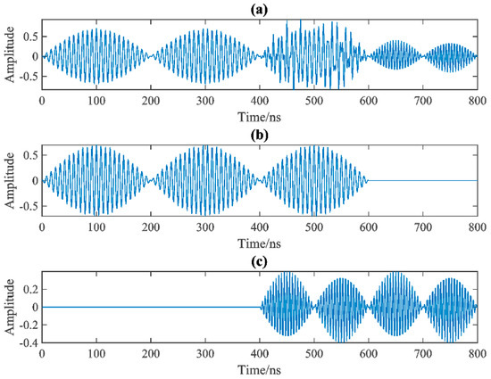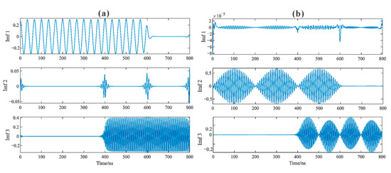 In this section, we show an example of a two−channel benchmark, where there exist three frequency modes. In the first channel (i.e., channel-1, see Figure 1a), there are 3 MHz and 20 MHz sinusoids (see Figure 1b,c) located on both ends of the signal, while the second channel (i.e., channel-2, see Figure 2a) consists of the 12 MHz and 20 MHz sinusoids with amplitude modulation (AM) as shown in Figure 2b,c.