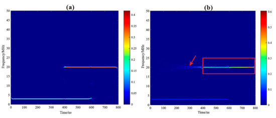We further highlight the merits of MVMD from the instantaneous spectrum. Here, we use channel-1 as an example. By using the Hilbert transform technique, the instantaneous amplitude and frequency can be estimated based on the IMFs decomposed by MVMD and VMD (see Figure 3a and Figure 4a), and then the corresponding time-frequency representations are shown in Figure 5a,b, respectively. The former tracks the 3 MHz and 20 MHz spectrum components with better resolution and convergences because the modes are well separated by the multi−channel decomposition scheme, as can be seen with the IMF1 and IMF3 in Figure 3a. In contrast, the 20 MHz spectrum component in Figure 5b exhibits an obvious endpoint effect (see the red arrow) and inaccurate amplitude representation (the red box).
