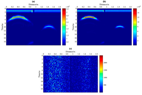 We apply the proposed method to model data by GPR forward simulation in this section. The model size is 2.0 m × 0.75 m, as in the schematic diagram shown in Figure 6. The subsurface half−space (0.75 m−thick) consists of two parts, i.e., dry sand (= 6, = 0.001 S/m) and wet sand (= 25, = 0.005 S/m), in which two metal cylinders or pipes (= 0.1 m) are buried, respectively. The impulse source (i.e., the transmitting antenna) with the center frequency of 900 MHz moves along the interface between the subsurface halfspace and air, and the transceiver distance is fixed as 0.4 m. The propagation of the electromagnetic wave is forward simulated using the open-sourced software GprMax3.0 [20], which is based on the finite difference in time domain (FDTD) method. The obtained GPR B−scan is shown in Figure 7a, which contains 180 A-scans and 1024 samples. We added Gaussian random noise (SNR = 20). It can be observed that the first-arrivals and the reflections by the two metal pipes are more obvious than the multiples in the deep part.