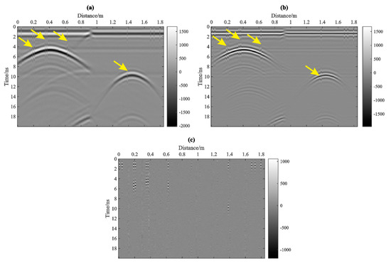 The operator of TKEO is only valid for describing the energy attributes of mono-component or narrow-bandwidth signals [16]. The waveform of each A−scan and the frequency components fluctuate due to the earth filtering and the noise interference. This phenomenon is referred to as the “non−stationarity” of geophysical data, which may affect the tracking of the reflection energy of the TKEO. When we perform the TKEO on each A−scan in Figure 7a directly, the resolution of the derived TKEO profile (see Figure 7b) is poor. In order to meet the applicable condition of the TKEO, we obtain the IMF-slices corresponding to three different frequency ranges (K = 3, see Figure 8) by using the MVMD. Figure 8a,b are the IMF-slices corresponding to the low- and medium-frequency vibration modes, where the direct wave and the first-arrivals by metal pipes can be seen, as indicated by the black arrows. There are several multiples at the bottom (see the red arrows), which affects target identification. Figure 8c show the high−frequency IMF-slice, which contain little meaningful information aside from the noise.