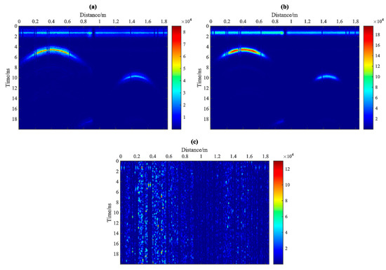 where , , and denote three adjacent samples in a non−discrete signal. According to Equation (8), it can be seen that only three samples on the time axis are required to calculate the TKEO, indicating that TKEO has obvious advantages for tracking or focusing the instantaneous energy of nonlinear signals with computationally efficiency. After decomposing the GPR B-scan to the IMF-slices, the operator of TKEO is executed on each A-scan of them, as follows: