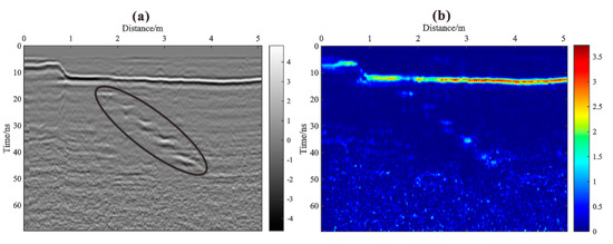 (a) B-scan of the field data, where the black circle indicates the voids; (b) the profile produced by performing the TKEO directly.