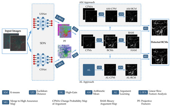In this section, we use Figure 1 to show the flowchart of unsupervised CD-SDN and detail it as followings. (1) the SDN is initially utilized to train the model parameters with pairs of pixels selected according to the specific sampling strategies, which are detailed in the experiment section. Thereafter, two images will pass through the trained model to get the bi-temporal projective features with noise suppression; (2) linear slow feature analysis (L-SFA) [20] enhances/inhibits the changed features/unchanged features for more effective segmentation; (3) after L-SFA process, Euclidean distance is respectively employed to the projective features resulted from unchanged sensitivity network (USNet) and changed sensitivity network (CSNet), to get the USNet-CPM and CSNet-CPM, both of which are grayscale maps with a range of 0–255 to display the change degree of pixel-level; (4) K-means method serves as a threshold algorithm to the USNet-CPM and CSNet-CPM respectively, and calculates the corresponding binary change maps, USNet-BCM and CSNet-BCM, in which, the well-defined logical states 0 and 1 could uniquely determine the changes of pixel-wise; (5) High-Gain is applied on USNet-BCM and CSNet-BCM to compute the binary argument map (BAM) with non-zero gain and high assurance map (HAM) with zero gain; (6) two approaches, arithmetic mean (AM) and argument learning (AL) are utilized to re-estimate the binary changes in the BAM of interest, this inevitably generates the corresponding CPMs, on which, K-means is then utilized respectively to obtain the corresponding binary change maps, AM-BCM and AL-BCM; (7) both re-estimated BCMs are merged with HAM, and therefore generate the final detected BCMs.