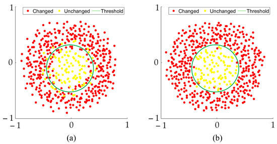 We feed two images across time to deep SDN for the generation of bi-temporal projective features. Then, L-SFA is employed as a difference algorithm to inhibit the unchanged pixels and enhance the changed pixels, while in the meantime, it corrects the deep features with error descriptions to a certain extent. Figure 3 shows the pixel distribution before and after L-SFA. Where the red/yellow dots indicate the changed/unchanged pixels, with a green line indicating the threshold. Before L-SFA, some red and yellow dots are on the edge of the threshold or in the opposing category, this will lead to error classification. To address this problem, the L-SFA algorithm produces a specific vector matrix, which is assigned to the bi-temporal projective features and achieves the effect as shown in Figure 3b. In addition, several noteworthy points are given as follows. First, the pixel inhibition and enhancement are not independent events, the pixels of two categories will move in opposing directions to produce a larger gap; second, L-SFA contributes to the difference of high-quality deep features, it is conducive to pixel classification, but has no supervisory behavior; third, in the case of acquiring low-quality projective features, the misdescription of pixels will be further amplified.